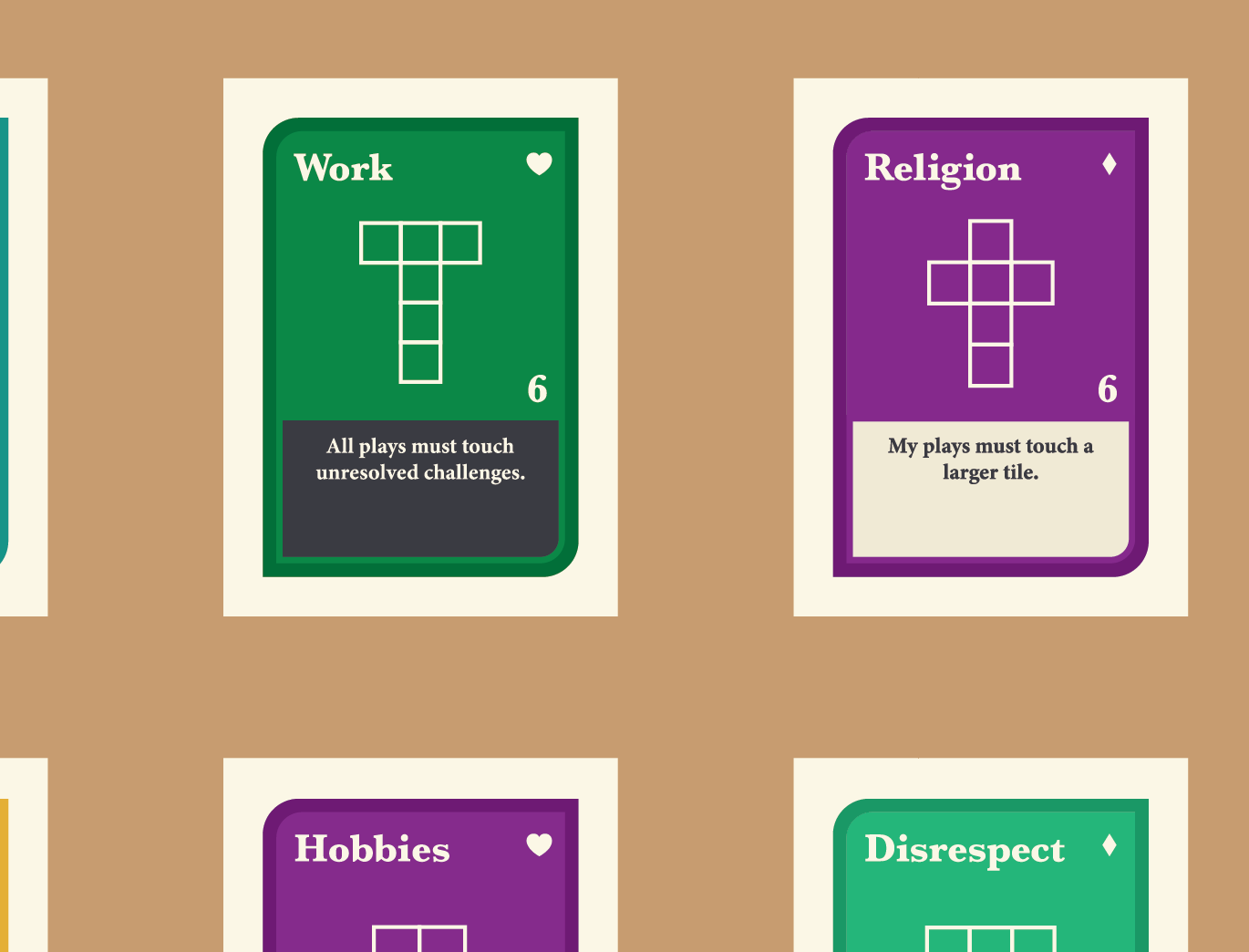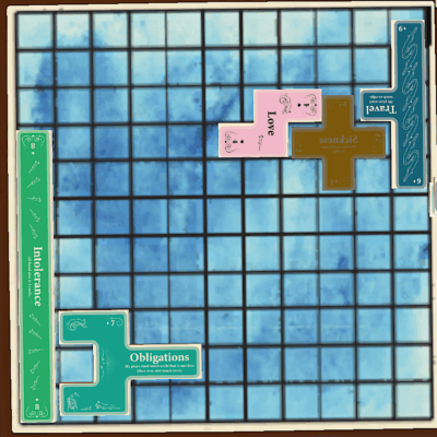 People have many kinds of relationships. We all bring some challenges to the table. Work, religion, children and much more can make it difficult for us to maintain those relationships. Love conquers all presents each of these challenges as a tile that must fit onto the grid of the board. Also, each challenge comes with a rule you must follow such as “Sickness: I can’t play near the edge of the board”. You must follow these rules until somebody plays a love tile that touches the challenge. This lets you invert it but you no longer need to follow that rule.